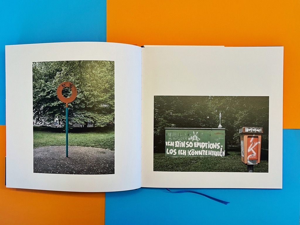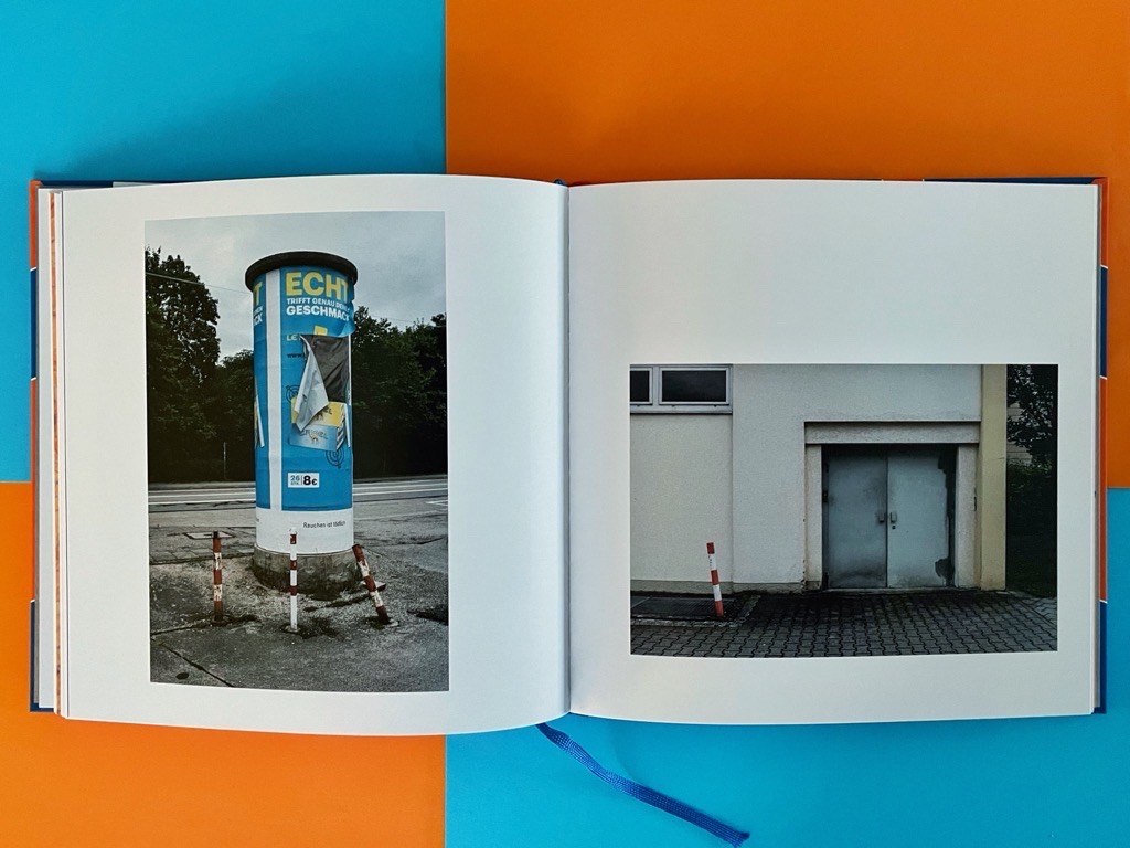 Wie bereits erwähnt, das Auffälligste ist sicher die Farbe und die Haptik, wenn man das Buch in die Hand nimmt. Zumindest bei mir weckte es Neugier. Der Titel „8000 München 70“ erinnert (die Älteren) an eine frühere Anschrift auf Briefumschlag. Martin Liebl erklärt die Idee seines Buches im Vorwort. Zwischen seinem persönlichen Lockdown im Rahmen einer Depressions-Erkrankung und dem allgemeinen Lockdown im Frühjahr 2020 hat Martin Liebl seine Umgebung im Süden von München während Spaziergängen beobachtet und in Form von Fotos festgehalten. Aus dieser Bildersammlung hat Martin einen rund 100 Seiten umfassenden Bildband erstellt. Die Bilder würde ich in die Kategorie Streetfotografie einordnen, sie zeigen Momentaufnahmen aus den Straßen Münchens. Kleine Momente, die den Alltag zeigen, wie zum Beispiel achtlos weggeworfenen Gegenstände, Sprüche auf Hauswänden oder (meist trist imponierende) Stadtarchitektur. Die Bilder beweisen ein ausgezeichnetes Auge von Martin Liebl, da findet man in den Fotos zum Beispiel als wiederkehrendes Element die gleiche Farbe, oder das gleiche geometrische Element. Auch bei den Fotografien von Kritzeleien auf Hauswänden zeigt der Fotograf eine gute Wahrnehmung. Mit dem Wissen, dass die Bilder während und zur Bewältigung seiner Depression entstanden, paßt ein Spruch wie zum Beispiel „Ich will wieder lernen auf meine Bedürfnisse & Gefühle zu hören“, der flüchtig auf einen Zaun geschrieben wurde, sehr gut und verdeutlicht die Stimmung des Fotografen zum Zeitpunkt der Aufnahme.