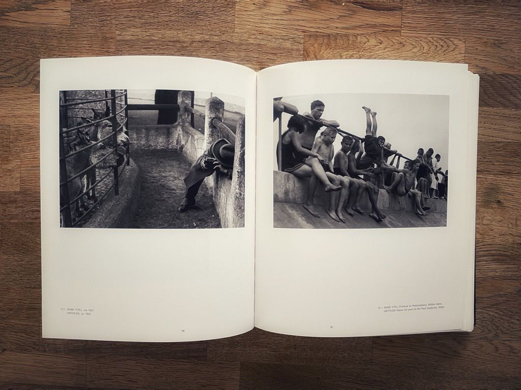 Seidenstücker fotografierte dabei nicht die typischen Szenen seiner Zeit, die man zur Wahrung der Geschichte fotografieren muß. Er hielt den Alltag in Berliner Straßen fest, die Menschen, die man vielleicht als „den kleinen Mann“ bezeichnen würde, zum Beispiel die Kofferträger am Bahnhof. Aber auch Menschen wie Du ich finden Platz in seinem Bildband, Menschen mit Fotoapparaten auf der Straße und im Zoo findet man immer wieder in dieser Bildauswahl. Dabei steht der humoristische Ansatz seiner Fotografie oft im Vordergrund. Herausheben möchte ich beispielsweise das Foto eines Zoobesuchers, der sich mit seiner Kamera für ein besseres Fotomotiv zwischen den Stangen des ersten Zaunes eines Tiergeheges verrenkt, ganz genauso wie sein „Modell“ vor der Kamera, nämlich die Esel im Gehege, die eine ähnliche Verrenkung vollführen, um näher an dem komischen Gegenüber zu sein.