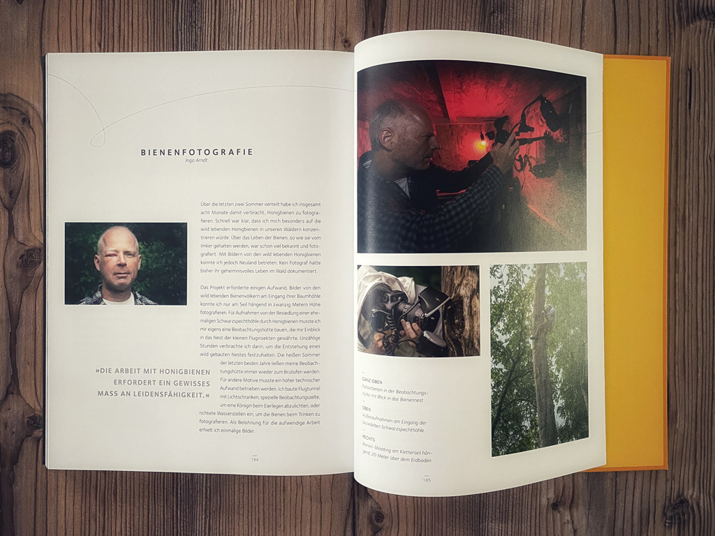 Dabei sorgt Ingo Arndt für viele beeindruckende Fotografien, die teilweise als Makroaufnahme die Bienen in einer unglaublichen Feinheit darstellen, zum anderen das Leben im Volk verdeutlichen. Die im Anhang befindlichen „Making-Of“-Aufnahmen zeigen den Aufwand, den Ingo Arndt und sein Team betrieben haben, um die Wildtiere vor die Kamera zu bekommen.