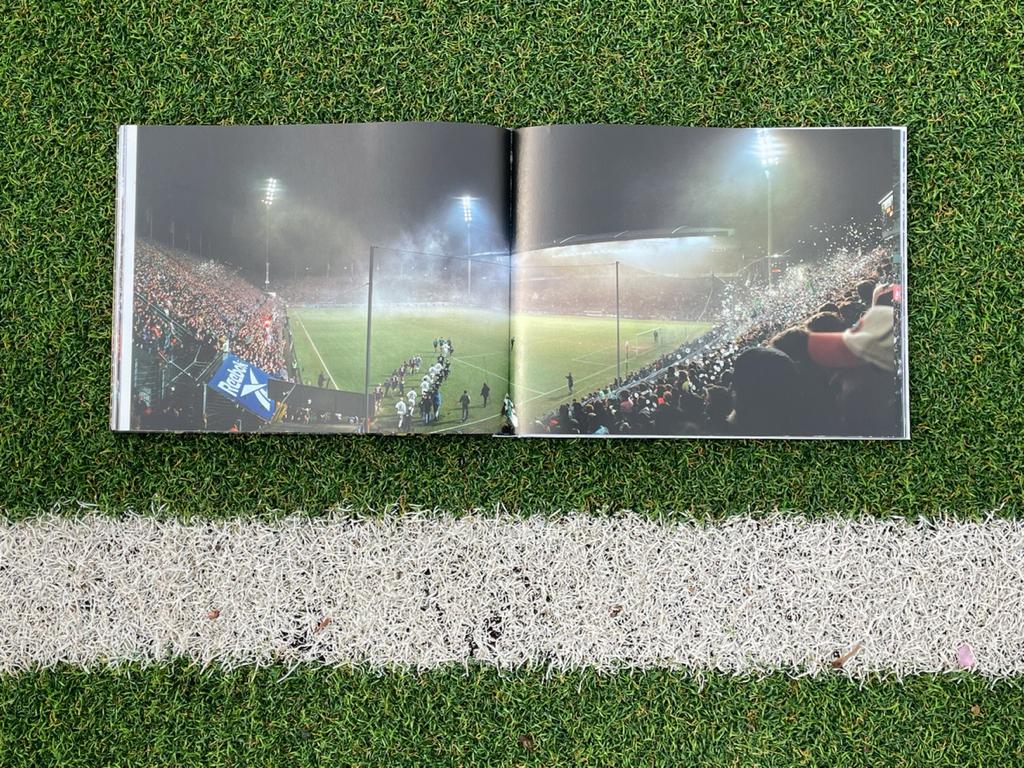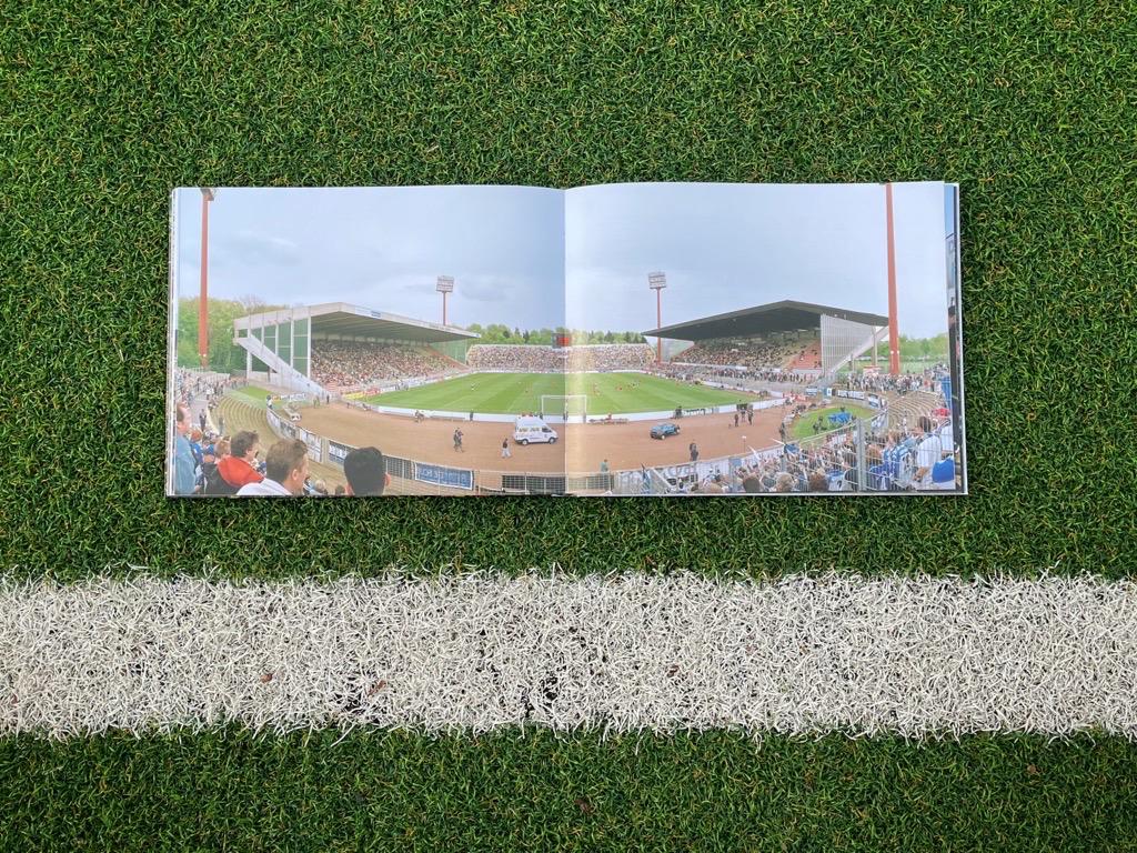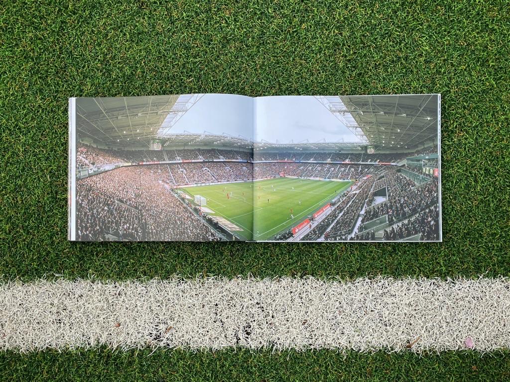 Im Bildband „Fussballtempel“ (Amazon * / Thalia *) zeigt Reinaldo Coddou die unterschiedlichsten Stadien in Deutschland, Österreich und in der Schweiz, die er nach und nach fotografiert hat. Dabei verwendet er eine spezielle Panorama-Kamera, die einen schönen Blick auf das gesamte Spielfeld und die Tribünen am bietet. Durch diese großformatigen Bilder hält er Erinnerungen von Stadien fest, die es in der Form nicht mehr gibt, wie zum Beispiel dem wohlbekannten Bökelberg in Mönchengladbach.