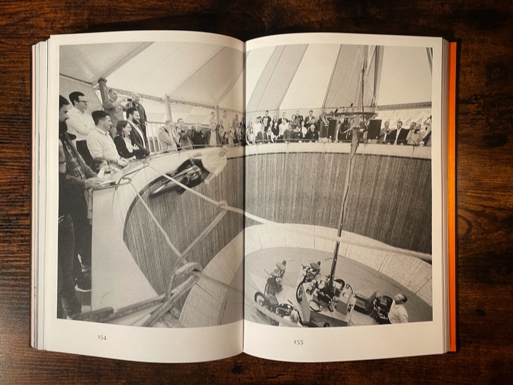 Bis zu diesem Buch hatte ich von Steilwandfahren als Attraktion nichts gehört, und wäre auch unsicher, ob ich mich auf dem Oktoberfest in das Zelt getraut hätte. Florian Holzherr gelingt aber mit dem Bildband eine gelungene Dokumentation dieser Faszination. Auch wenn die schwarz-weiss Fotos ruhig und gelassen wirken, springt der Funke für diese atemberaubende Kunst auf den Betrachter der Bilder. Man kann beinahe beim Genießen des Buches das Knattern der Motorräder hören und das Benzin riechen.