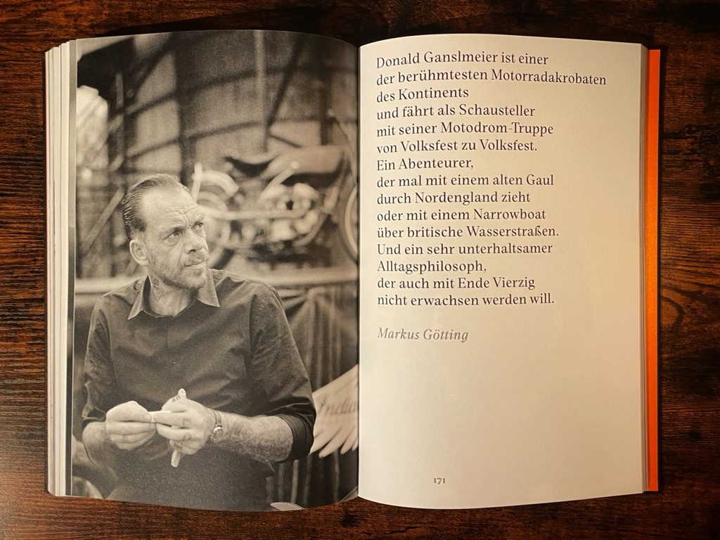 Ein letzter Teil des Buches stellt Donald Ganslmeier in den Vordergrund, der soetwas wie der Chef des Motodroms und der Motorellos ist. In einem ausführlichen Interview, das der Journalist Markus Götting führt, schildert Ganslmeier das Leben als Motorradkünstler.